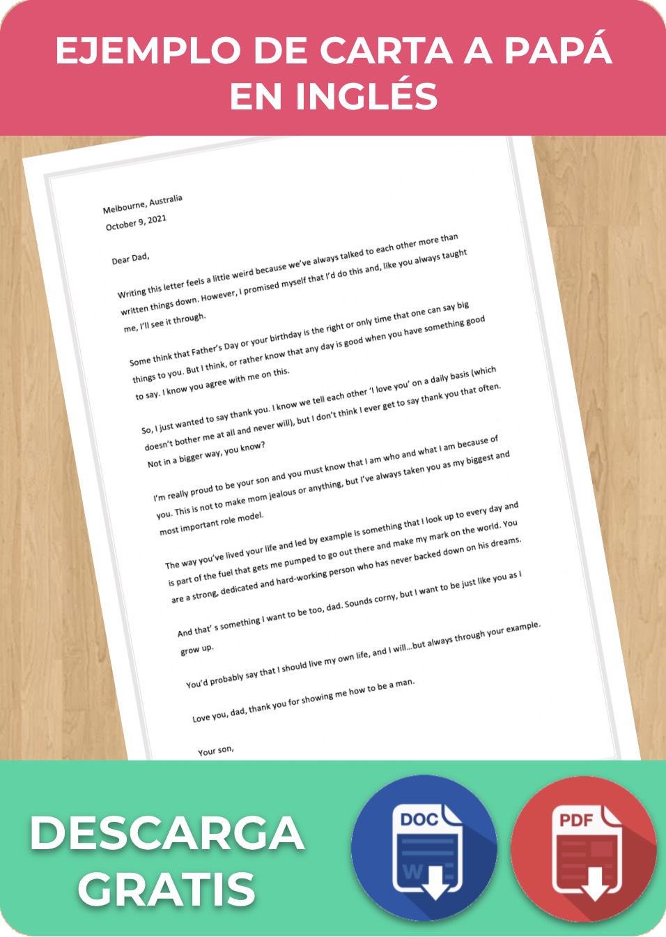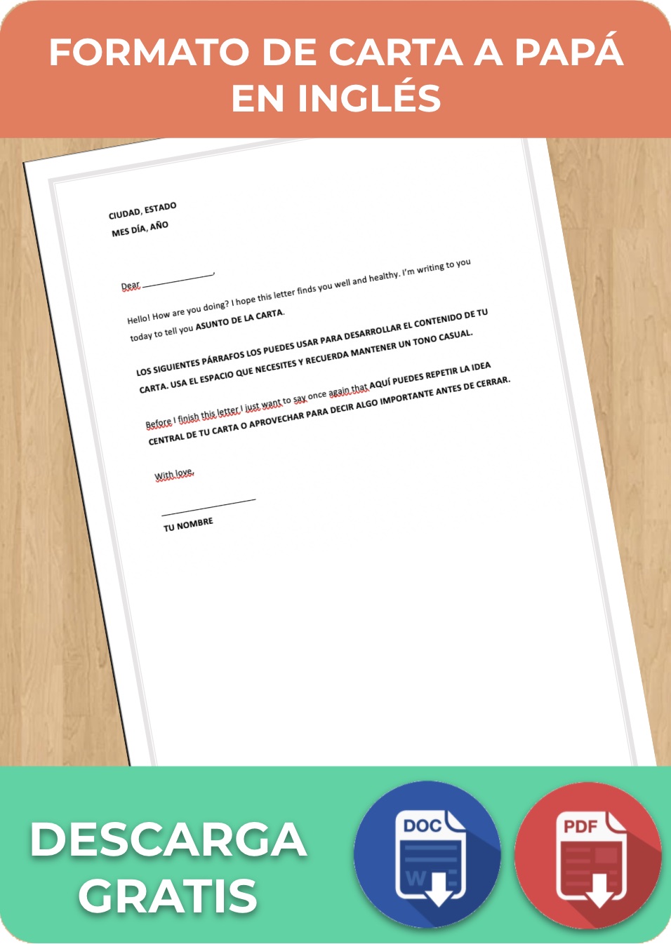 Por último, te presentamos un formato y un ejemplo de carta a papá en inglés que puedes descargar gratuitamente para editar en Word o en Google Docs. Puedes usarlos como referencia, así como editarlos a tu conveniencia.