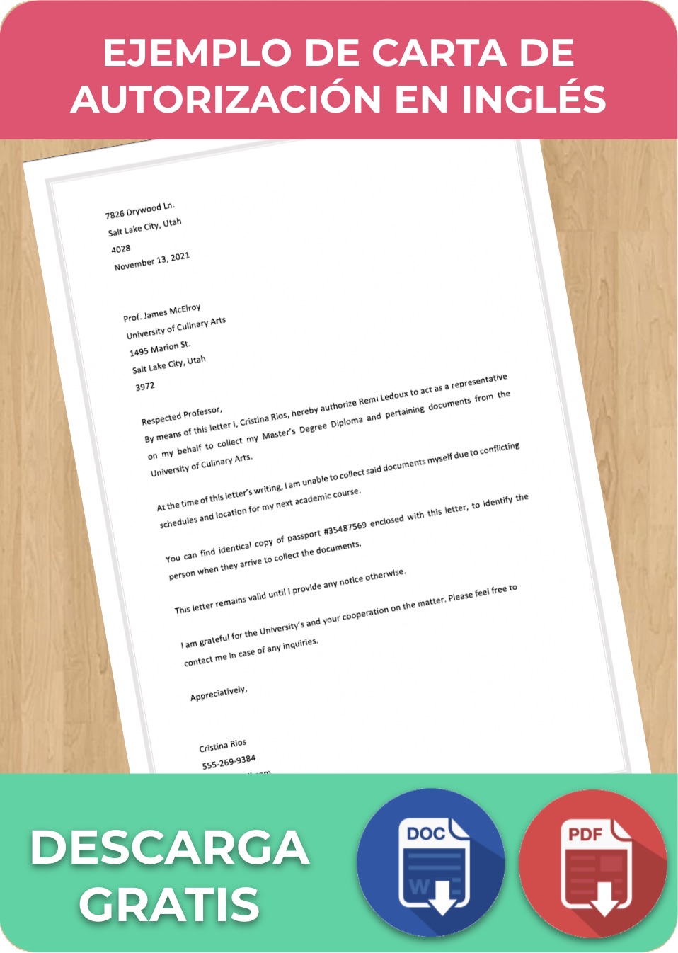 «Por medio de esta carta yo, Cristina Ríos, autorizo a Remi Ledoux para actuar como mi representante para recolectar mi Diploma de Maestría y los documentos pertinentes de la University of Culinary Arts.»