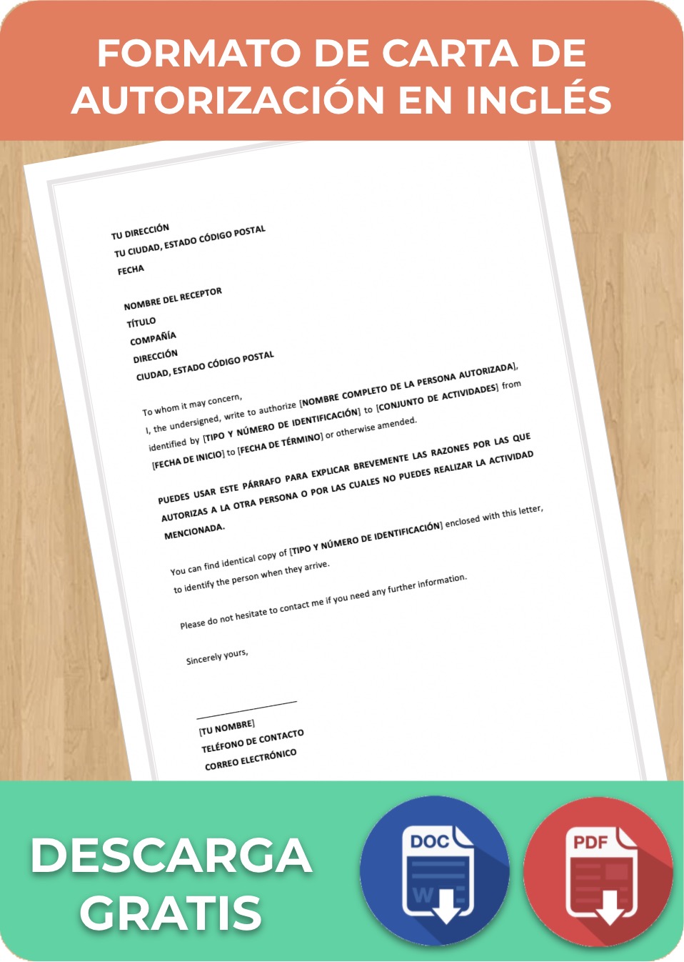 | [I, We], the undersigned, hereby authorize [NOMBRE COMPLETO DE A QUIÉN AUTORIZAS] identified by [TIPO DE IDENTIFICACIÓN CON O SIN NÚMERO] to [ACTIVIDADES] from [FECHA DE INICIO] to [FECHA DE TÉRMINO] | [Yo, Nosotros], quien suscribe, por este medio autorizo a [NOMBRE COMPLETO DE A QUIÉN AUTORIZAS], quien se identifica con [TIPO DE IDENTIFICACIÓN CON O SIN NÚMERO] para realizar [ACTIVIDADES] del [FECHA DE INICIO] al [FECHA DE TÉRMINO]. |