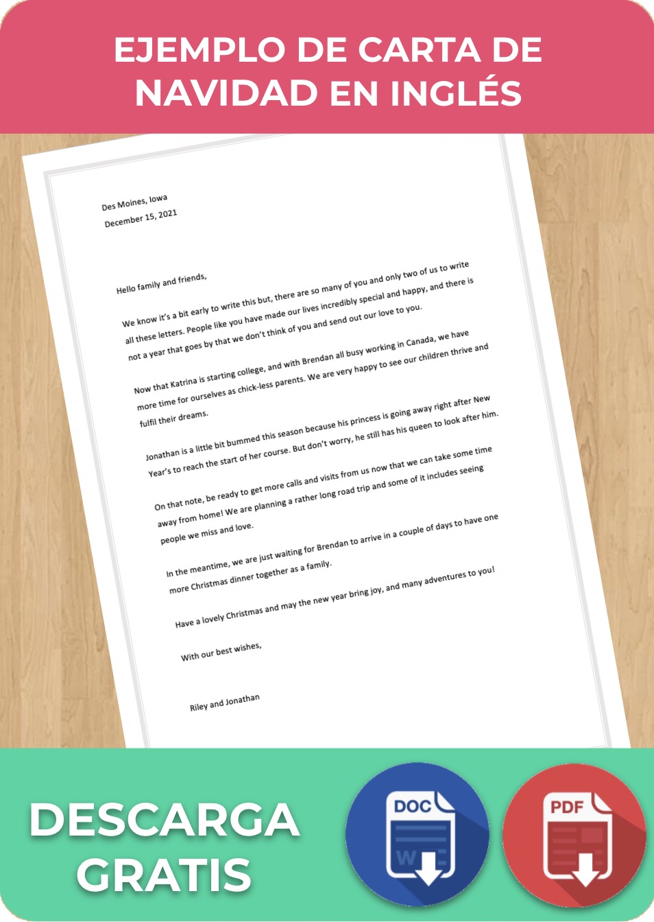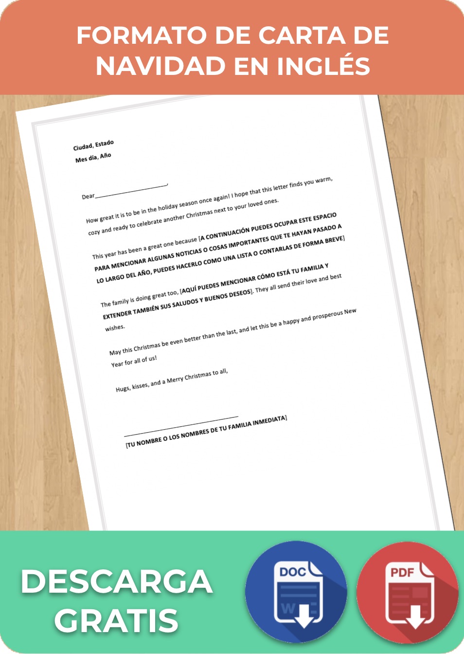 Por último, te presentamos un formato y un ejemplo de carta de Navidad en inglés gratuitos, que puedes descargar para editar en Word y en Google Docs. Puedes usarlos como referencia, así como modificarlos a tu conveniencia.