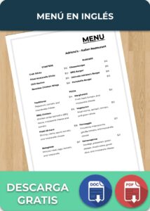 Para terminar, te dejamos un ejemplo y un formato de menú en inglés para Word y Google Docs que podrás descargar y editar completamente gratis. Usa el que más te sirva y adáptalo a tus necesidades.